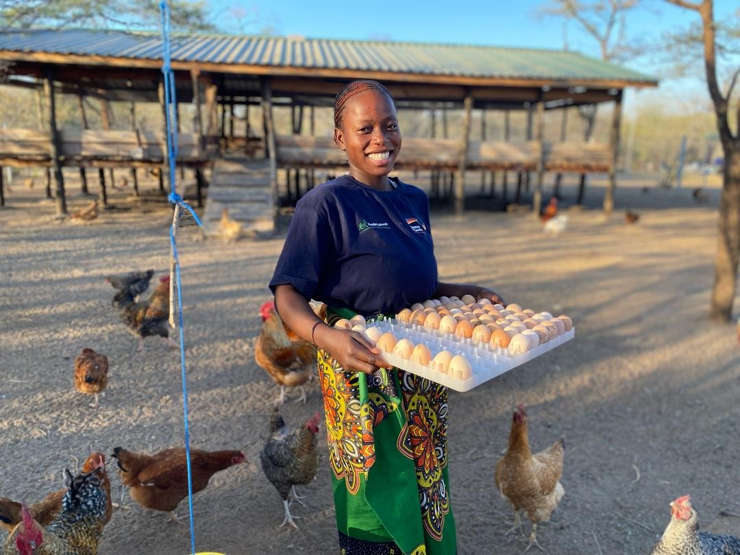 In Chirundu District, 24-year-old Precious Kagodola gently gathers freshly laid eggs into a tray....